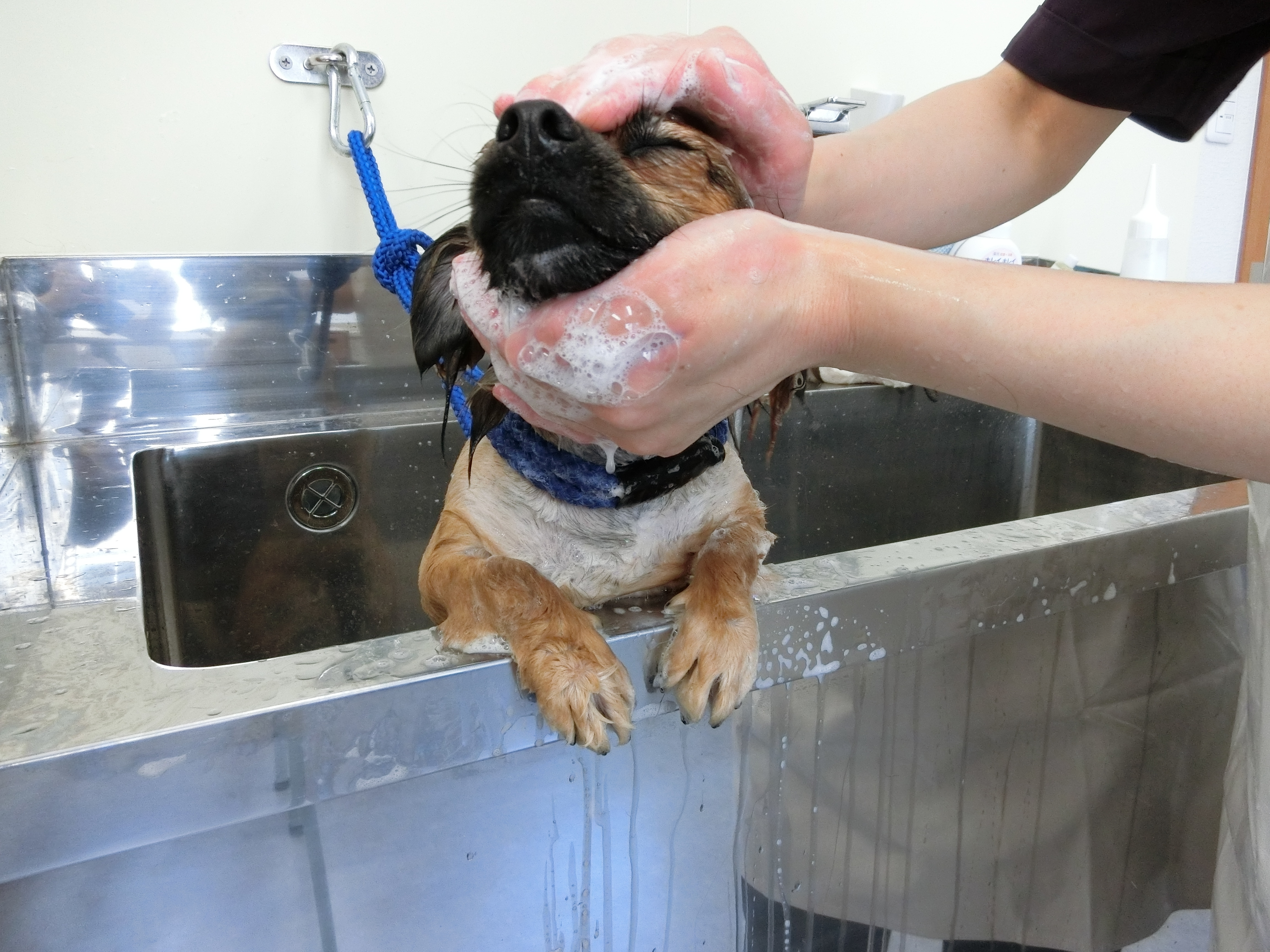 シャンプーが苦手だと、飼主様に教えて頂いていたので・・事前に「飛び出し防止リード」装着してます♥